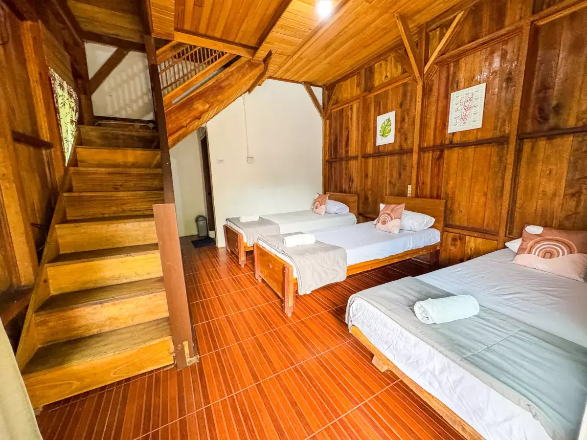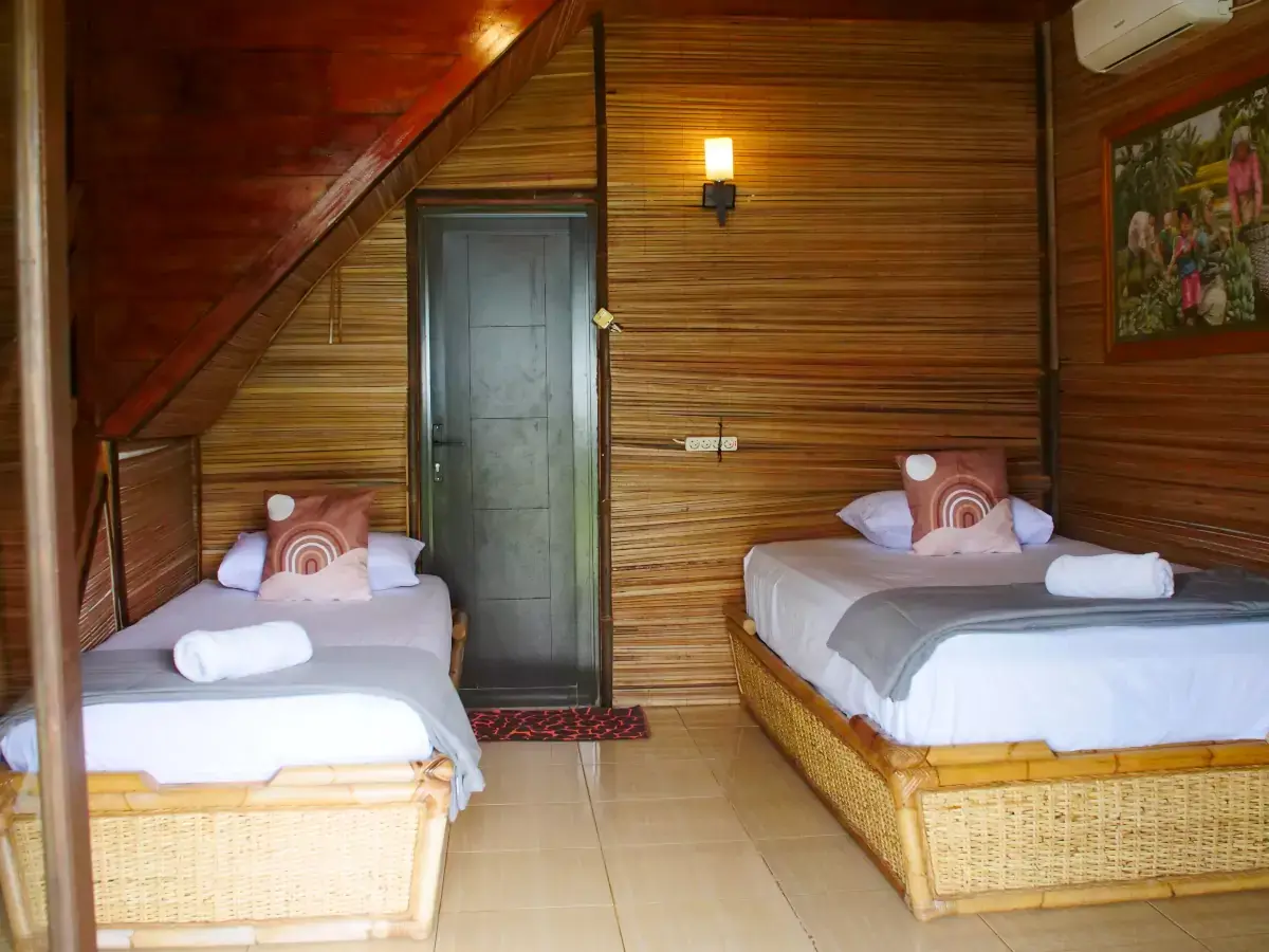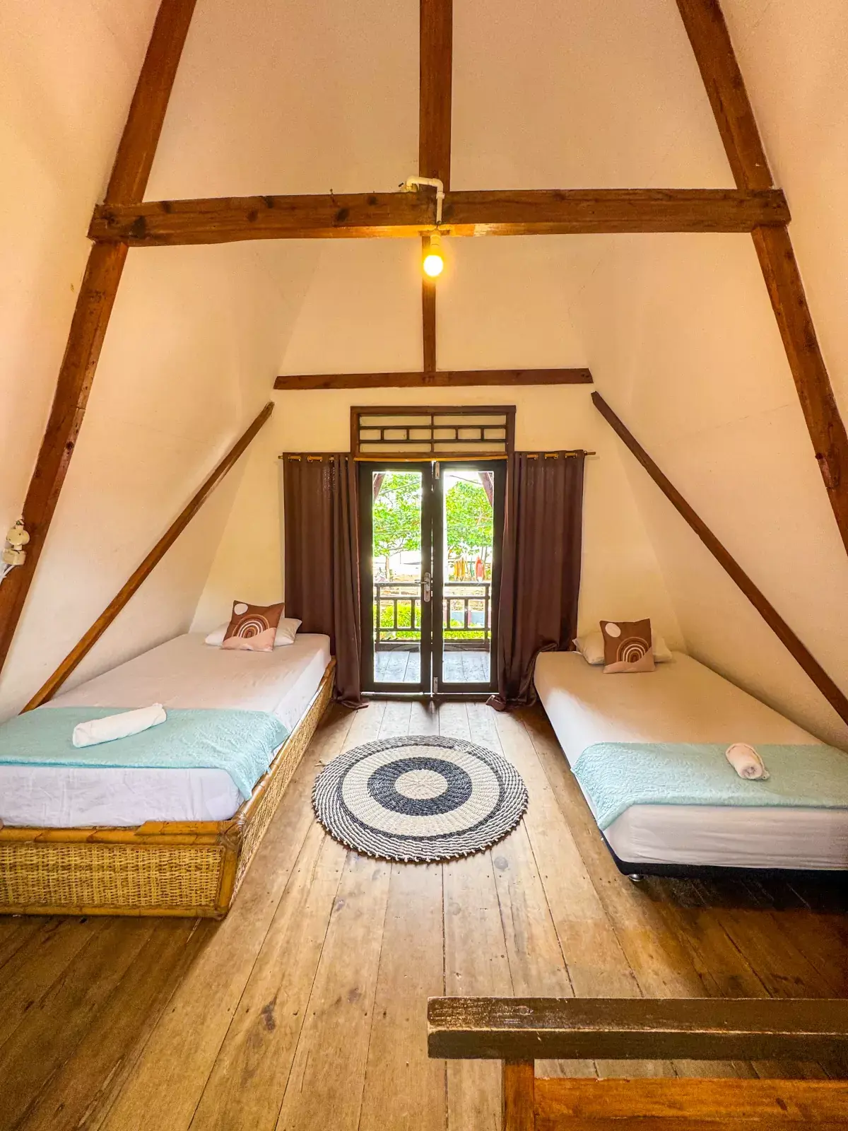 Two storey A-Frame design with air-conditioning and private bathroom. Downstairs has two twin beds and upstairs has two twin beds. Private balcony with ocean views.